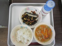 ご飯、牛乳、ちゃんこ汁、ししゃもフライごまソース(2個)、野菜ふりかけ