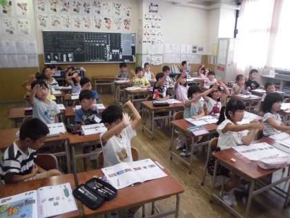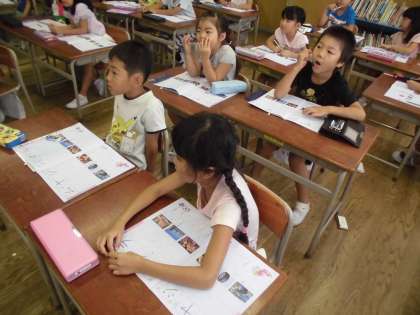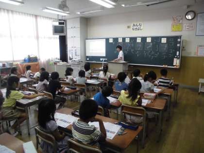 しょしゃの時間に、カタカナの練習をしました。「おれ」や「まがり」に気をつけて書きました。