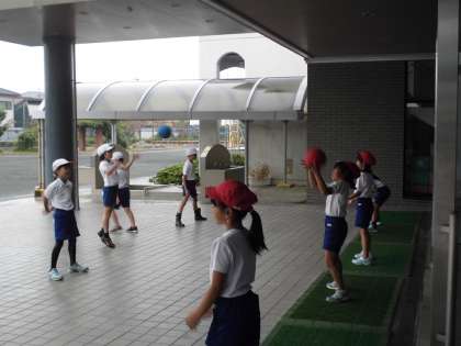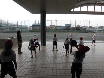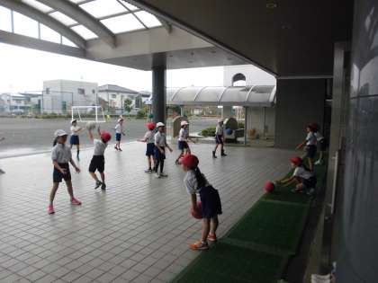 運動の途中で雨が降ってきたので、屋根のあるエントランスの下でボールを投げたり、受けたりしました。
