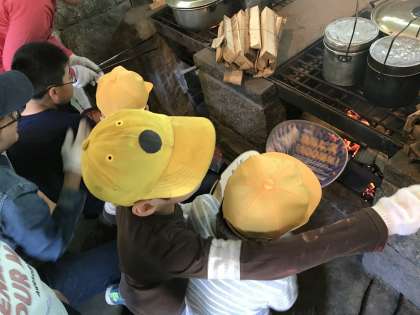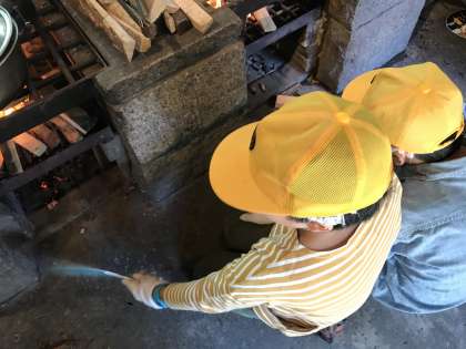 かまど係さんががんばっています。火が強くなってきました。うまくできているでしょうか。