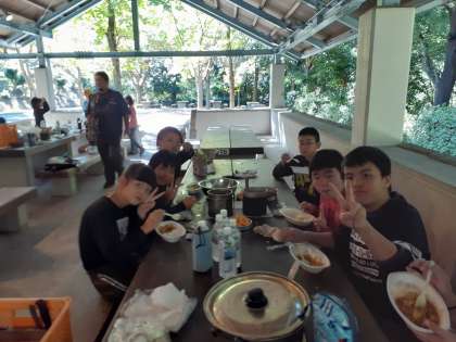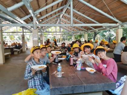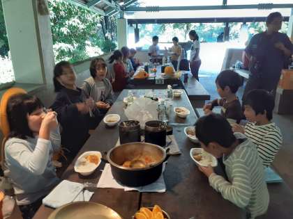やっと出来上がった昼食。ごはんの歌を歌って食べ始めました。