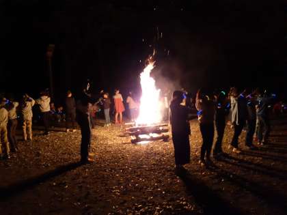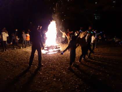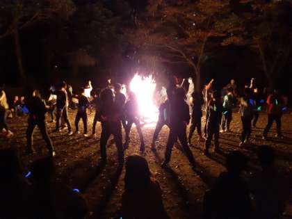 司会の児童とキャンプカウンセラーさんの司会のもと、クラスでそれぞれの出し物を出したり、先生たちの出し物で楽しんだりしました。最後に、カウンセラーさんにトーチトアリングをしていただきました。