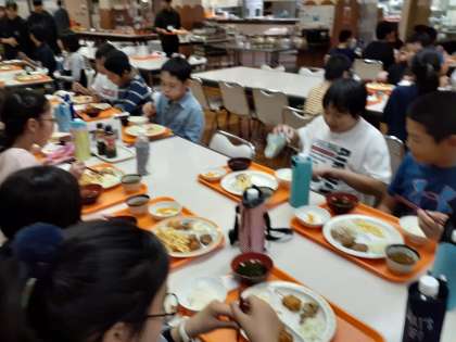 夜はバイキング形式の夕食。自分で好きなだけ盛り付け、班のみんなと楽しく食事をしました。