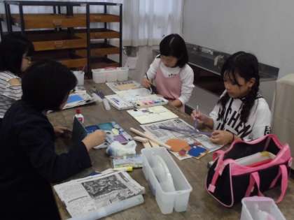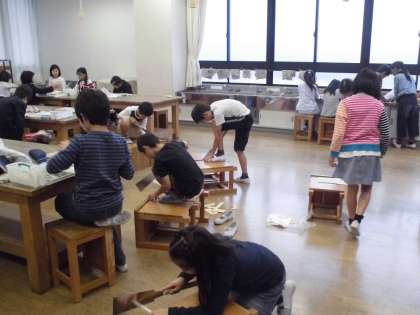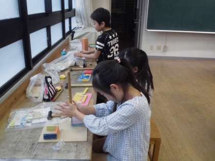 材料をのこぎりで切って部品をつくっています。作った部品は色をぬってはりあわせていきます。