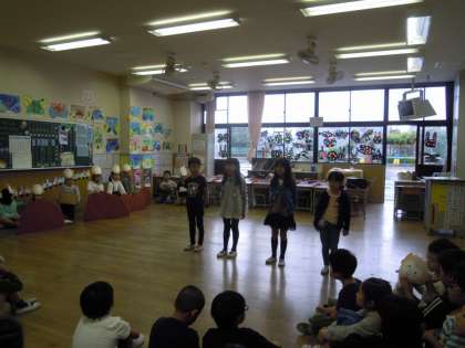これまで場面ごとに分かれて練習をしてきましたが、今日は、お互いにここまでの練習の成果を披露し合いました。友達の演技を見て、いいところ、真似したいところをたくさん見つけることができました。体育館でもよく聞こえる大きな声で話すことが、今後の課題です。みんなで励まし合いながら、頑張っていきます。