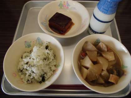わかめご飯、牛乳、関東煮、豆腐のごまみそだれ