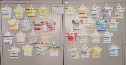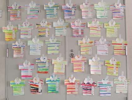 筆の使い方を工夫して、しましま模様のTシャツをつくりました。