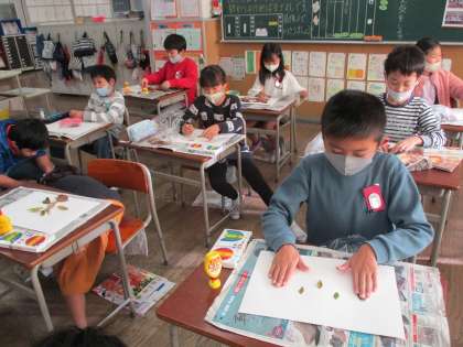 落ち葉を使って、貼り合わせ方を工夫していろいろな形やもようを作りました。