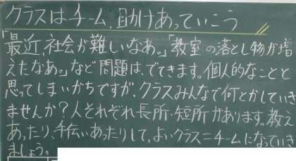 4年生の黒板に担任のメッセージが書かれていました。