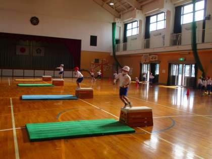 1段の跳び箱に飛び乗ったり、飛び降りたりしました。飛び降り方は自分で考えたやり方でやってみました。