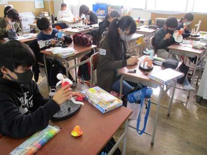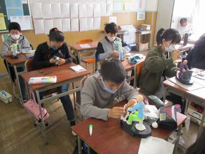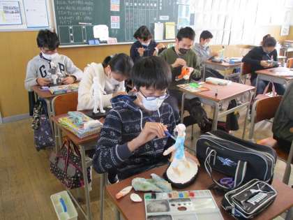 針金に紙粘土を貼り付けて、動いている人を作りました。今日は、作品に色をつけて仕上げていきます。