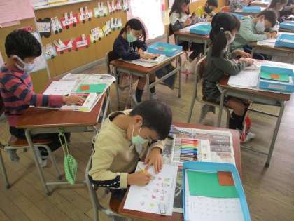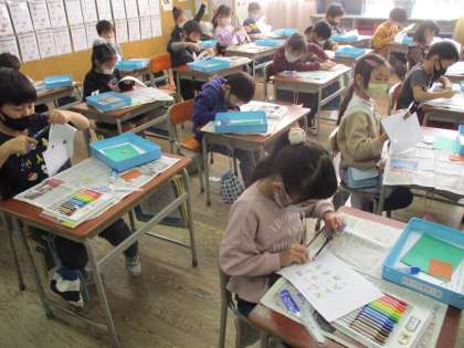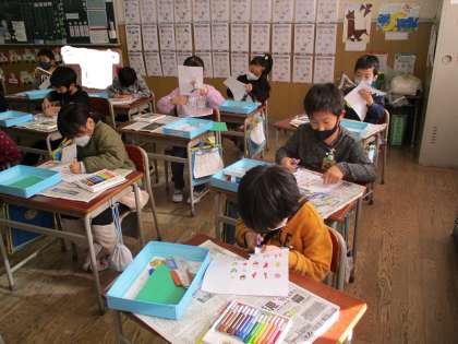 色ぬりをして、紙を切りぬいて木に貼り付けて完成させます。