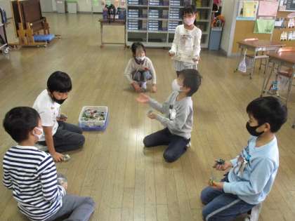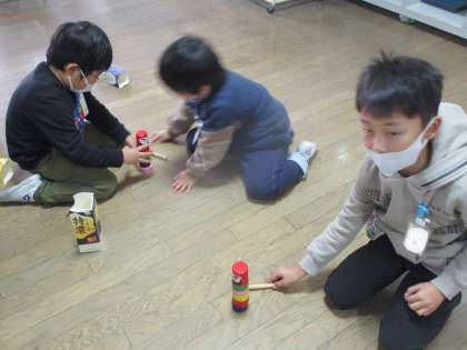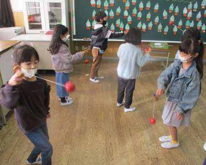 例年は大和老人連合会の皆様を講師に招いて、昔遊びを教えていただくのですが、今年は自分たちだけで昔遊びに挑戦しました。今日は、けんだま、こま、だるま落とし、お手玉をやりました。