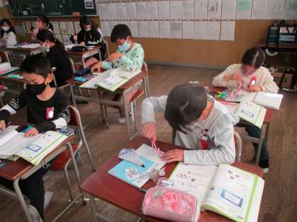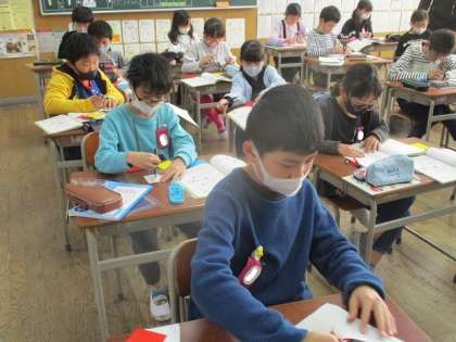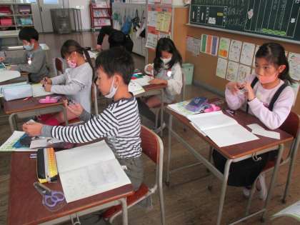 コンパスを使って円をかき、オリンピックのマークをつくりました。