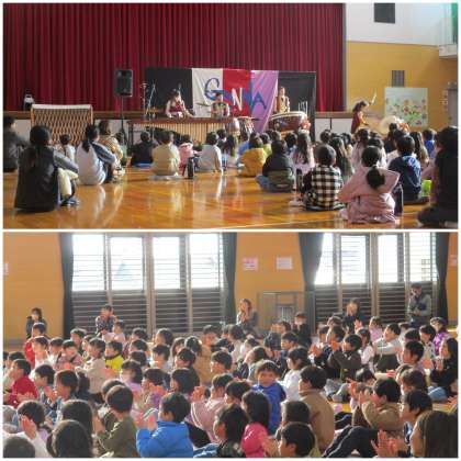 今日は芸術鑑賞会がありました。「GONNA(ガナ)」というグループの方に来ていただき、和太鼓とマリンバの演奏を聴きました。和太鼓の迫力とマリンバの優しさに、子どもたちも真剣な表情で聴き入っていました。