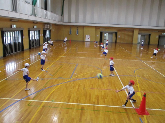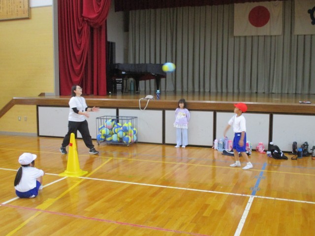 ペアでドッジボールを使ってキャッチボールをしました。相手がとりやすいところに投げられるよう、気を付けて投げました。