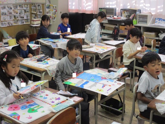 「ワニぼうのこいのぼり」という絵本を読んでもらいました。そして「自分だったらどんな動物を鯉のぼりにしようかな?」と考えて絵画に表しました。いろいろな鯉のぼりが描かれています。