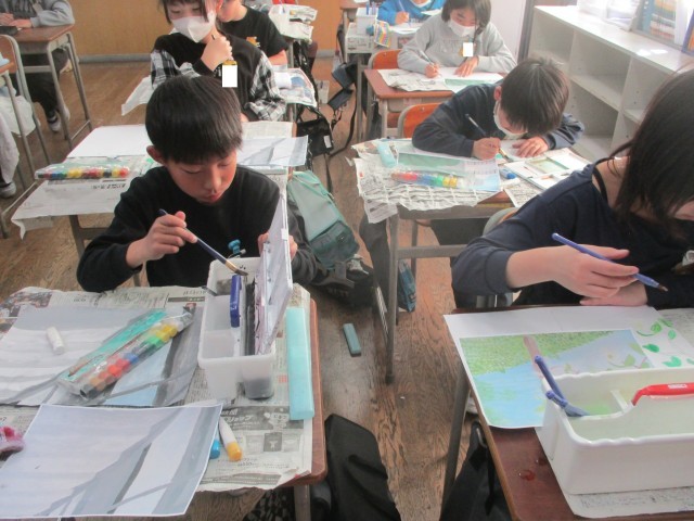 来年度の写生大会に向けて、上手な作品を模写しました。色の作り方や色の濃さ、筆の方向などに気をつけて取り組みました。