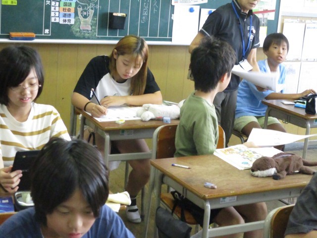 キャンプを楽しんだことや、思い出を伝えるヒノキの板ハガキを製作しました。イラストや色合いを工夫していました。