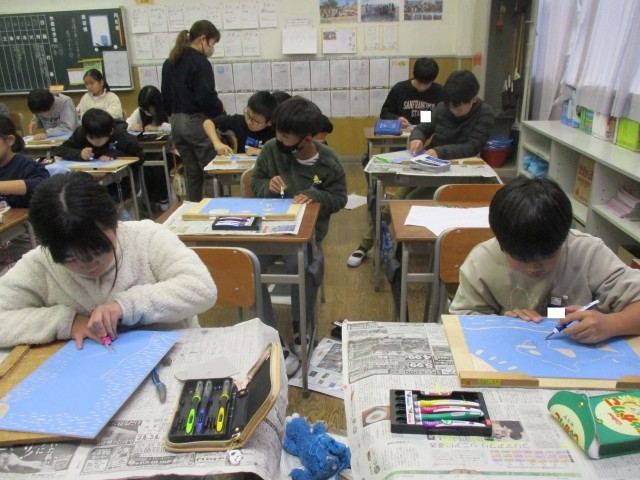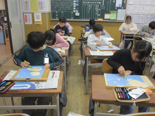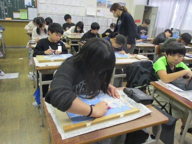 「動物と季節」をテーマに、下絵をかいて版画を彫り進めています。丁寧に作業を進めています。