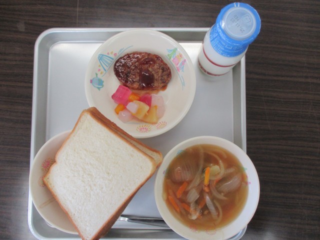 ☆今日の献立☆ハンバーグのケチャップソースがけ ぶどうゼリー和え コンソメスープ