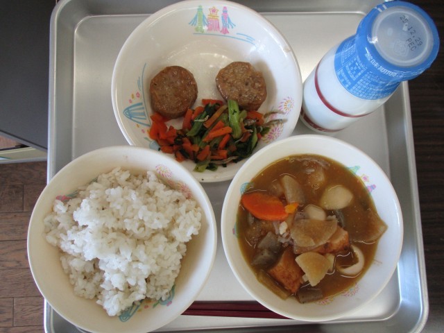 ☆今日の献立☆ポークカレー 焼きフランクフルト 福神漬和え