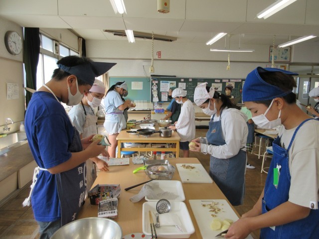調理実習がありました。最初にじゃがいもの皮むきのテストを行いました。どの子も家で一生懸命に練習し、テストを頑張りました。それから班で協力して「ベーコンポテト」を作りました。作ったら、さっと片づけをし、ゆっくり会食。手際がよくなった姿に成長を感じました。