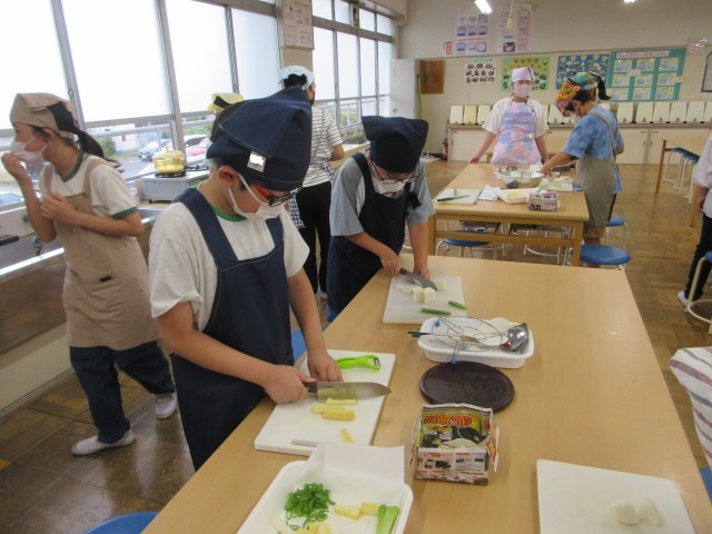 今日は5年生の調理実習で、ごはんと味噌汁を作りました。グループの友達と一緒に、声をかけ合いながら、良い雰囲気で実習ができていました。