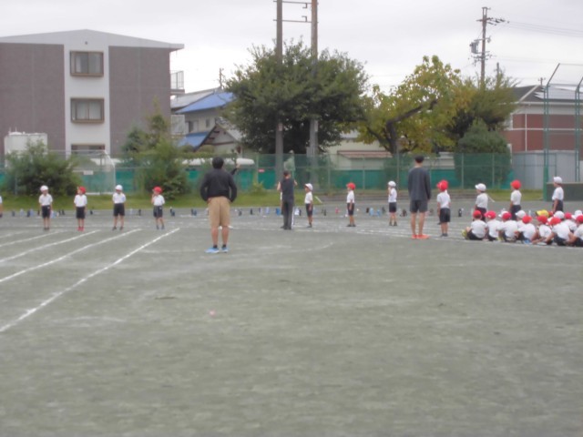 前回、屋内運動場で並び方の練習をしたので、今日は運動場で実際に走ってみました。