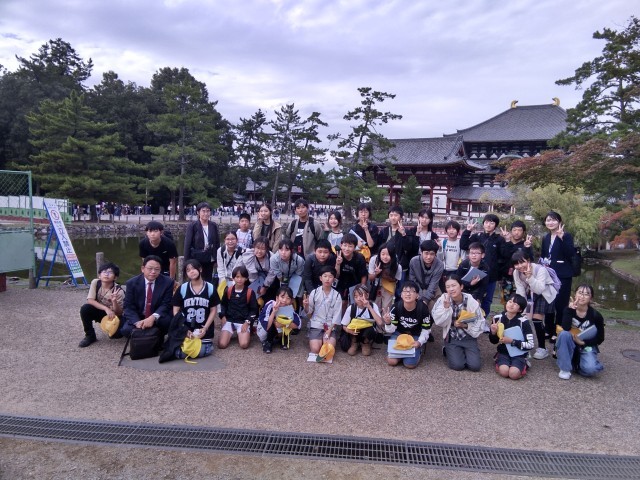大仏殿前の鏡池で集合写真です。ここまで来るのに何度も鹿に囲まれましたね。