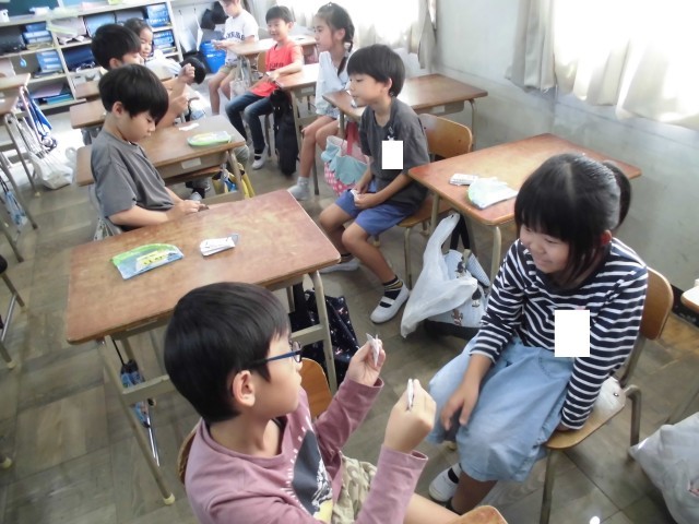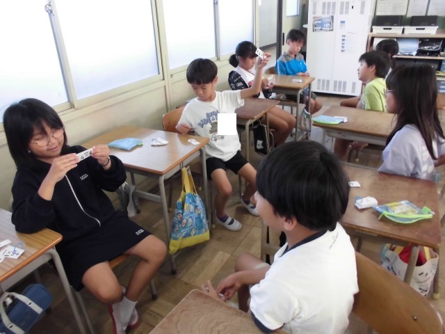 九九カードで九九の練習をしています。ペアで問題を出し合って、答えています。「九九が言えるようになりたい。」とみんな頑張っています。