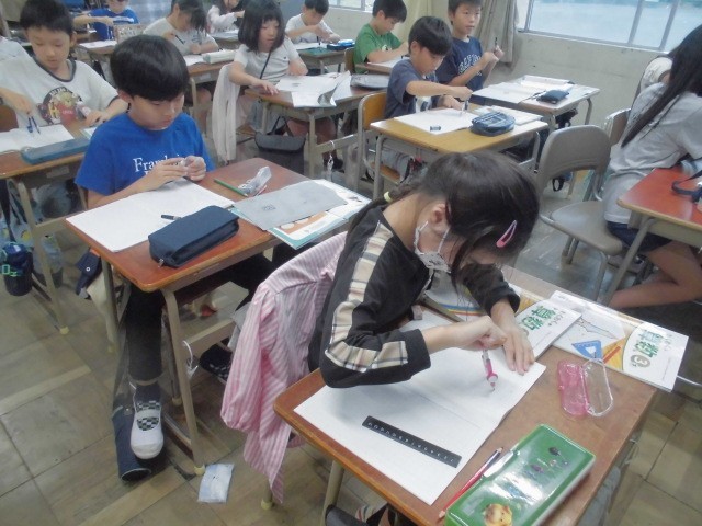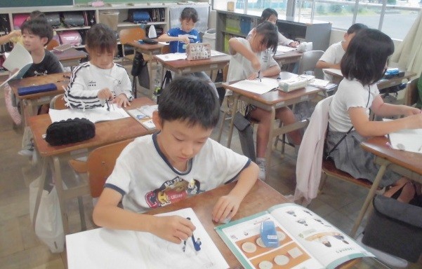 算数では、円と球の学習をしています。コンパスを使った円を描いてみました。コンパスを使えば、簡単に円が描けると思っていたようです。コンパスのはりがノートから抜けたり、うまく一回転できなかったりして、思うような円が描けません。これからの学習を通して、コンパス名人をめざしていきたいです。