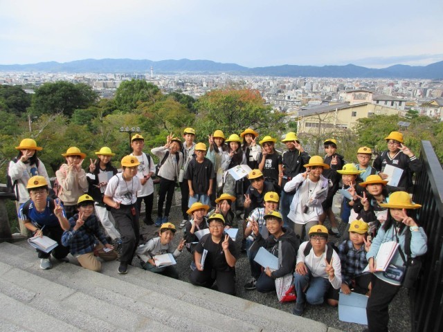 今日の最初の観光地は清水寺です。仁王門を登ったところです。通って来た清水坂をバックに記念撮影です。