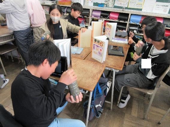 理科の学習では、地層のでき方について学習しています。今日は、れき・砂・どろを混ぜた土をペットボトルに入れ、どのように積もっていくかを観察しました。次は、体積のモデルでも実験をするので、楽しみです。