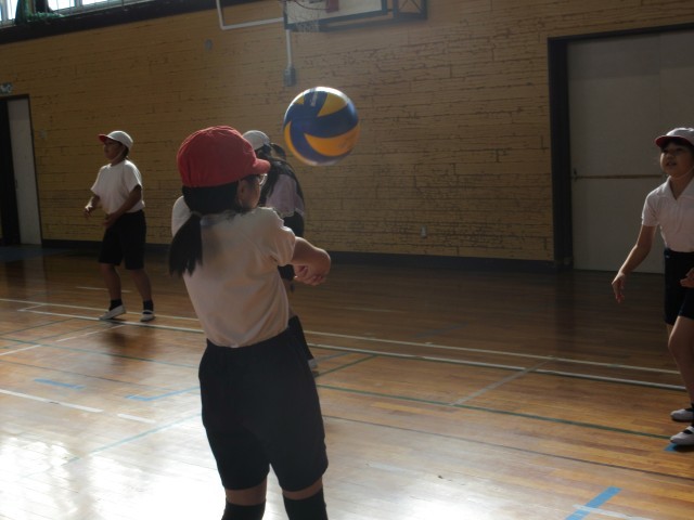 前回オーバーハンドパスを練習して、今回はアンダーハンドパスを中心に練習しました。相手に向かってまっすぐボールをとばすことが難しく、大きく上がってしまったり、思わぬ方向にとんでいってしまったりしていました。最後に続けてパスをしましたが、オーバーハンドパスが上手なペアが一番長く続いていました。