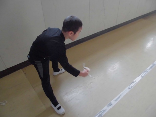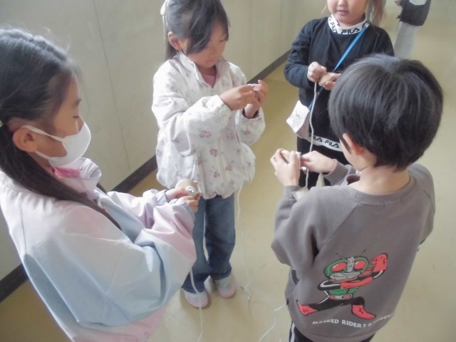 こま回しの練習をしています。まだ、なかなか上手に回すことができない子が多く、休み時間などにも一生懸命に練習する姿が見られます。