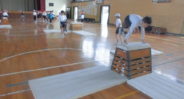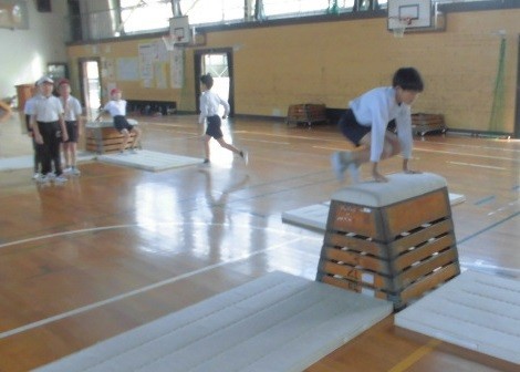 体育では、跳び箱運動を行っています。3年生で初めて挑戦する「かかえこみ跳び」の練習をしました。踏み切りの仕方や目線などについて、お互いに見合ったりアドバイスをし合ったりしました。
