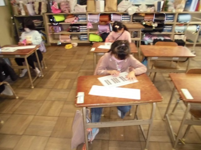 紙鍵盤を使って運指の練習をしました。音は出ないけど、真剣に取り組めました。