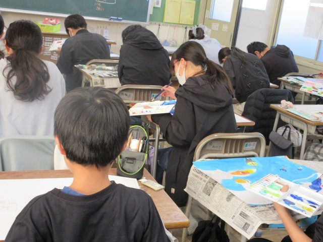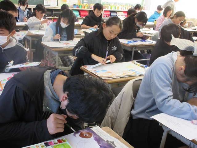 どの子も自分の描き表したい場面を構図に工夫して、丁寧に作品を描いています。出来上がりが楽しみです。