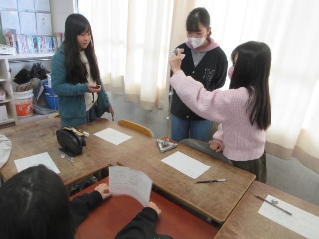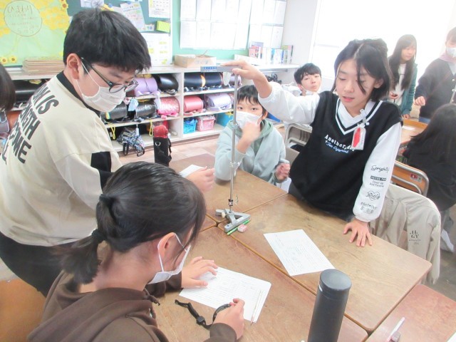 理科でふりこの学習をしました。実験器具を使って振れ幅と1往復する時間の関係について調べました。みんなグループで協力していました。