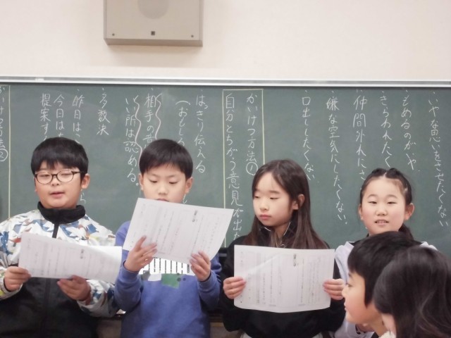 道徳の時間に「なんと言ってつたえる?」という教材を使って、人権について学習しました。自分の考えと違う意見が出たときに、相手の気持ちを大切にしながら自分の思いを伝える方法について話し合いました。子どもたちは、「どう言えば相手がいやな気持ちにならないか」「どんな言い方なら気持ちが伝わるか」を一生懸命に考え、言葉の選び方の大切さに気付くことができました。