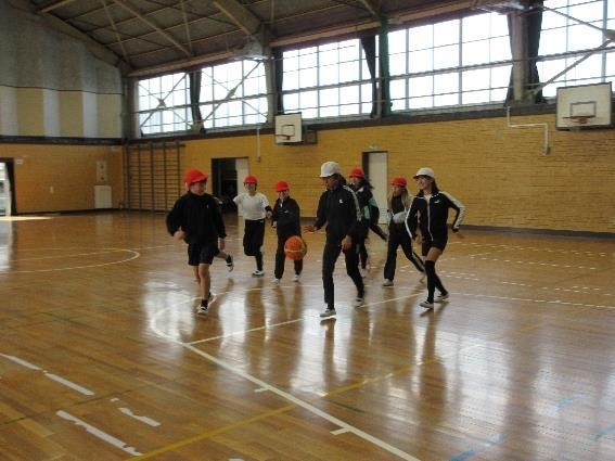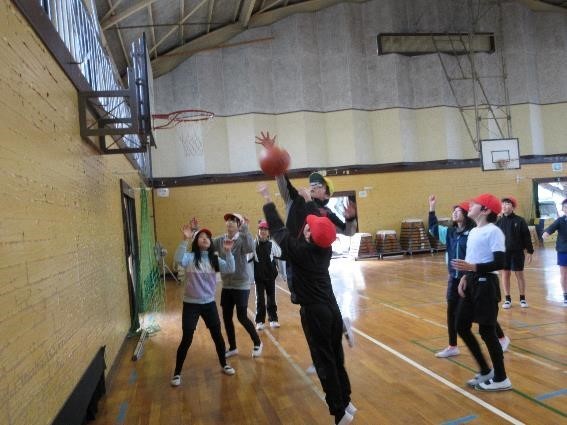 体育の時間には、バスケットボールを行いました。新しいチームで試合をしました。どの子もゴールを目指してボールをつなげていました。