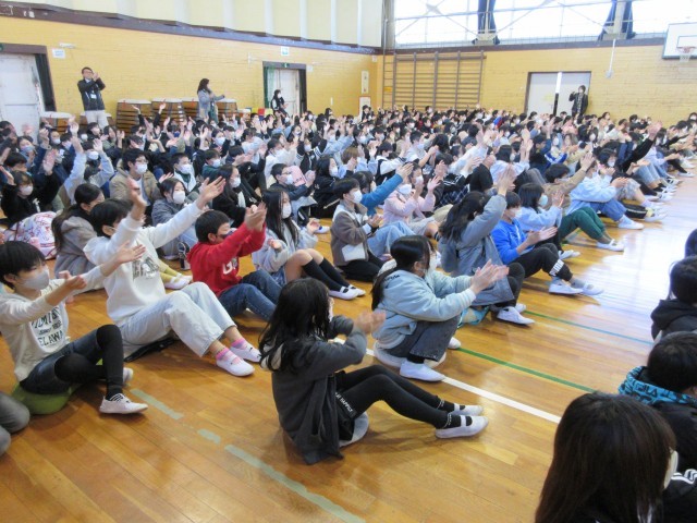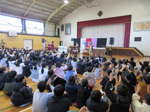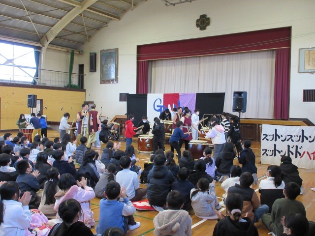 本日、本校では芸術鑑賞会を行いました。和太鼓とマリンバを中心とした演奏が体育館いっぱいに響き渡り、子どもたちは迫力ある和太鼓の音や、マリンバの温かく美しい音色に引き込まれていました。リズムに合わせて体を動かしたり、目を輝かせて演奏を見つめたりする姿が多く見られ、音楽の楽しさを全身で感じることができた一日となりました。プロの演奏に触れる貴重な機会となり、子どもたちにとって心に残る芸術鑑賞会となりました。