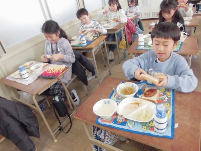 今日の給食は、チーズハンバーガ-でした。みんな大喜びで、自分でハンバーガーを作って、おいしくいただきました。