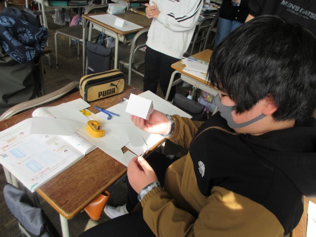 算数の時間に三角柱・円柱の展開図をかきました。できた図を切り取り組み立てると、穴が空いてる子、きちんとできた子と様々でしたがみんな頑張って取り組んでいました。
