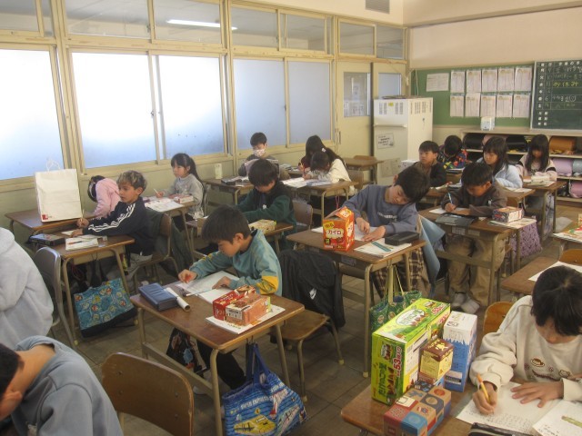 「はこの形」の学習に入りました。子どもたちが家で用意し持参した箱を調べました。