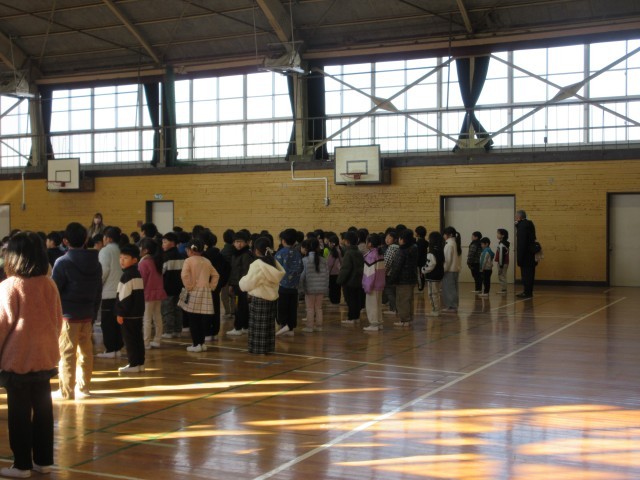 2月初め頃から、各学年で6年生を送る会の練習を始めています。今日は1年生の学年練習がありました。代表で話す子たちに合わせて、「おめでとうございます。」「ありがとうございました。」など、大きな声で、元気に呼びかける姿がみられました。