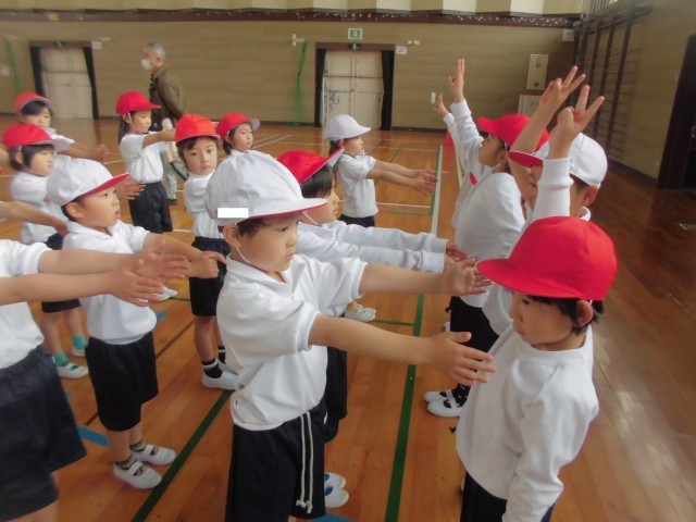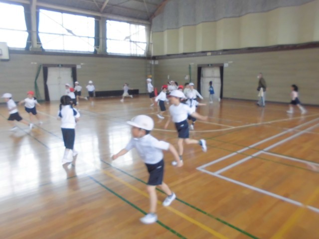 屋内運動場で体育の授業を行いました。整列の仕方や、準備運動の仕方を覚えました。最後に、みんなで楽しくおにごっこをして遊びました。