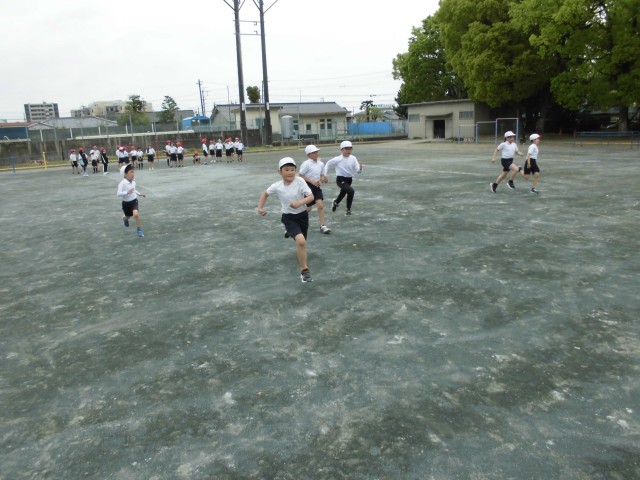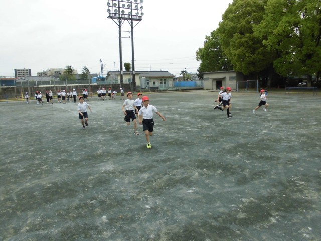 3年生の体育は体つくり運動をしています。今日は体力テストに向けて短距離ダッシュをしました。