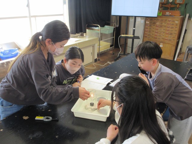 線香で空気の動きを確認しました。そして、ろうそくの火が燃え続けるのは、空気が入れかわることで燃え続けることが分かりました。